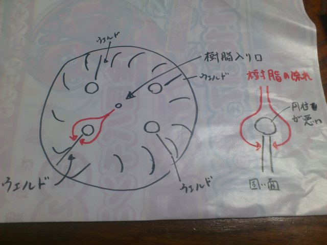 要は、ファンの真ん中から型に対して樹脂を注入している段階で、ボルト穴となる部分の「向こう側」に