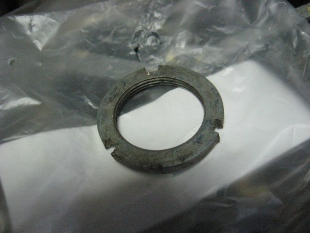 ステムナットのダブルナットの「上側」に使うナットなのですが、写真の物はヤマハ系の純正品でして、本来はピンスパナで作業する様に溝が入っているワッカ上のナットになりますね。
