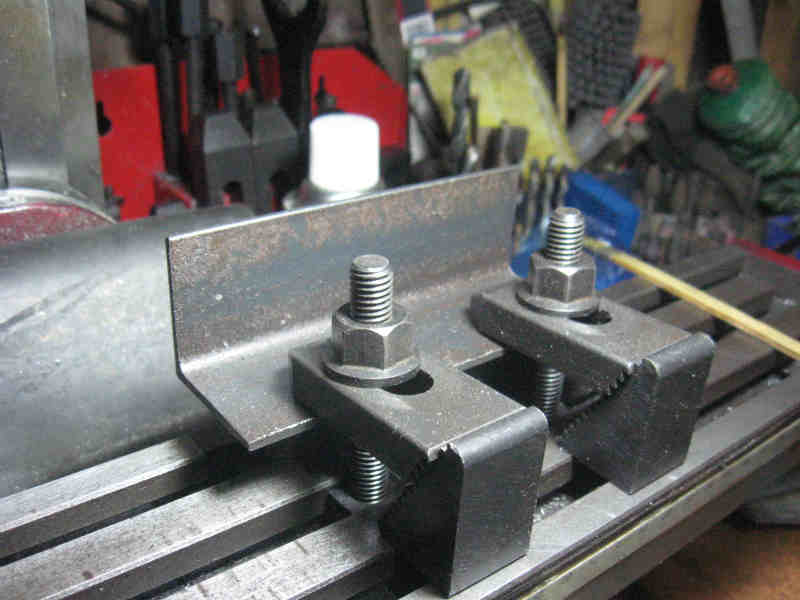 適当なSS400の鉄ブロック材をアングルで挟みますが、これはあえて左右方向、X軸方向をクランプしています。(+下駄です)