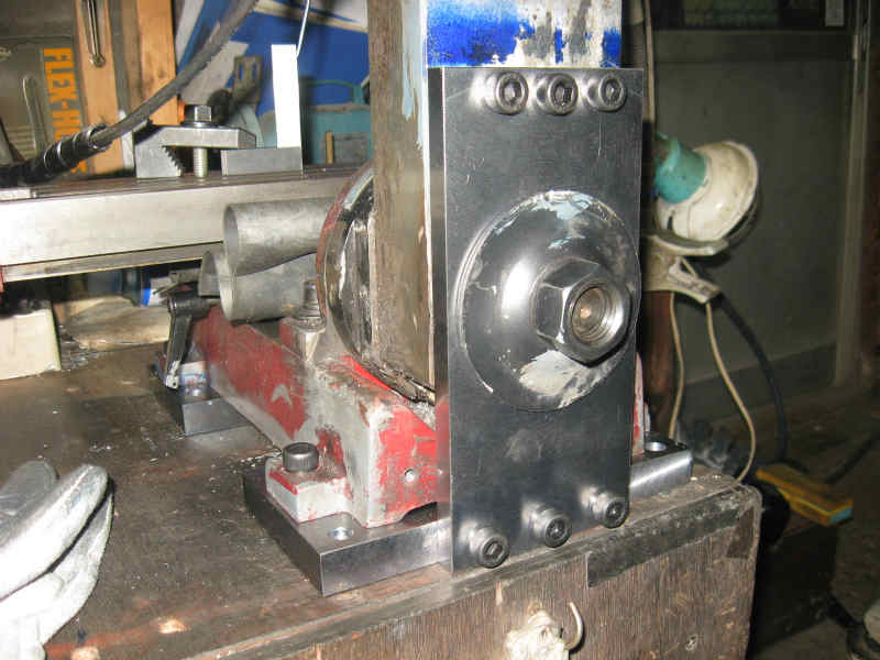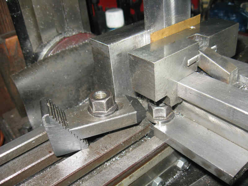 8x10角のS45C角棒を用いてこしらえた超硬チップをくっつけたバイトを、スライド出来る様に角溝にマウントしました。
