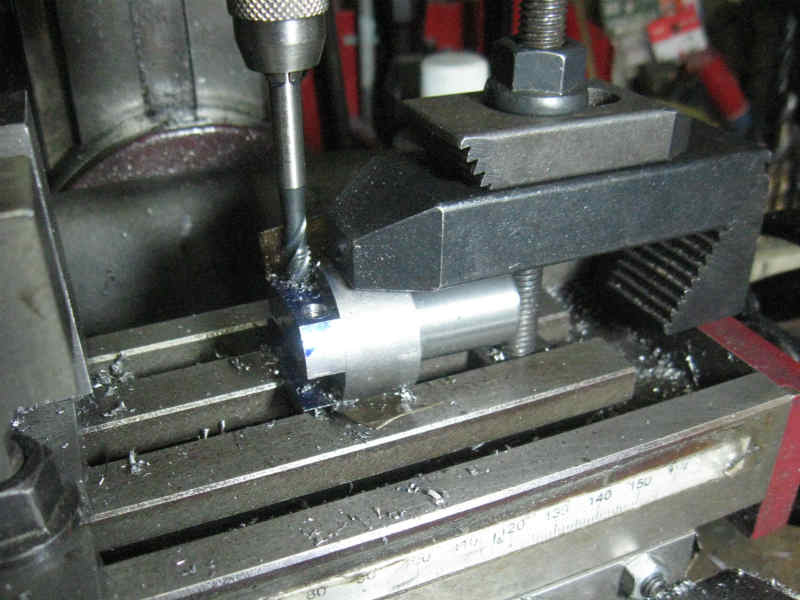 溝を掘った後には、平面部に穴を開け、バイト固定ボルト用のねじ山を切っていきます。