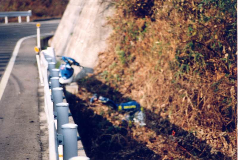 側溝に青いJOGがボテこんでおり、その下の浅い谷底には青いツナギが落下しておりますが。