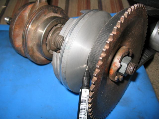 まずは駆動系パーツを組み込みエンジンをかけ、一度ベルトを「張った」状態にし、その上でエンジンを止め駆動系をばらさず、写真の様にマジックを使いベルトの外周側に沿って線を引いていきます。