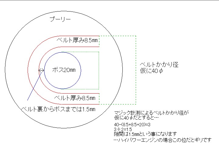 図中では実測でのベルトかかり径を「40φ」としていますが、この状態でベルト厚みが8.5oでボスが20φの