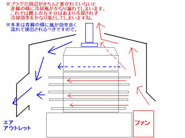 どう考えても、プラグ穴部分から風が逃げているのであれば、腰上の左半分には冷却風が圧送されにくくなり、