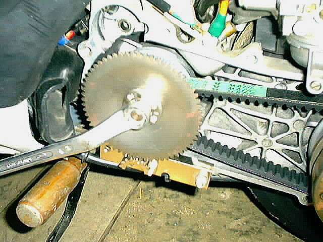 これは、クランクケース本体に工具をボルトで固定し、工具本体のギヤ状の部分がフェイスの歯車部分とガッチリ噛み合う仕組みです。
