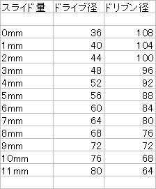 では、ここで先程の駆動系構成を一例とし、実際のベルトかかり径となる数値の一覧表をご覧下さい。