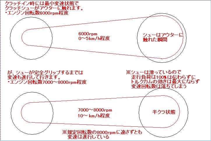 ※くどい様ですが、クラッチシューがアウターに接触する瞬間を「クラッチイン」、完全に食いついた時を