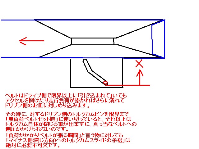 ドライブでは側圧が足らずベルトが空転しかけ、それを抑えるはずのトルクカムは、ドライブ側ベルトの