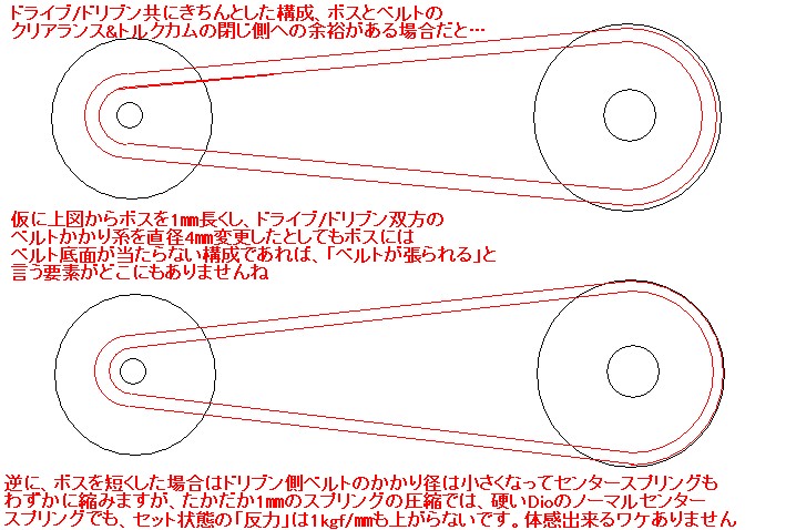 となれば、ドライブ側ベルトかかり径も小さくなる方向へ動くのですが、ここでボスとベルト内側のクリアランスが