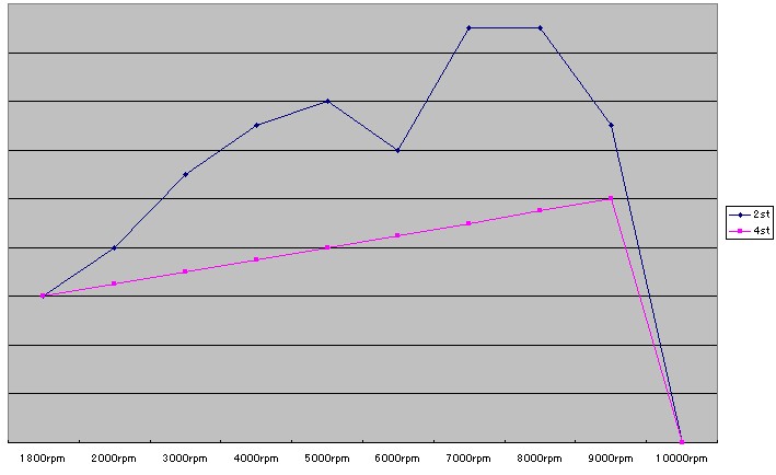 (※2stの青線で一度パワーが落ち込んでいる所は混合気充填効率の悪い「谷」ですね)