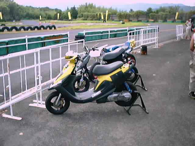 手前からレース用ノーマルJOG-ZR、SAクラス用JOG-ZR、元々はM12クラスのレーシングマシンで今は2AクラスマシンになっているNSR50です。