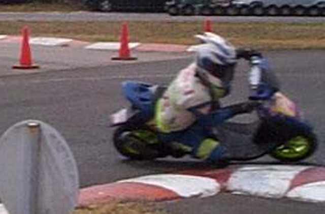 ・・・お尻が浮いているのは、スクーターレースと言う物はマシンを漕ぎながら駆け足でスタートしますので、十分スピードがのればマシンに「飛び乗る」んですよ。